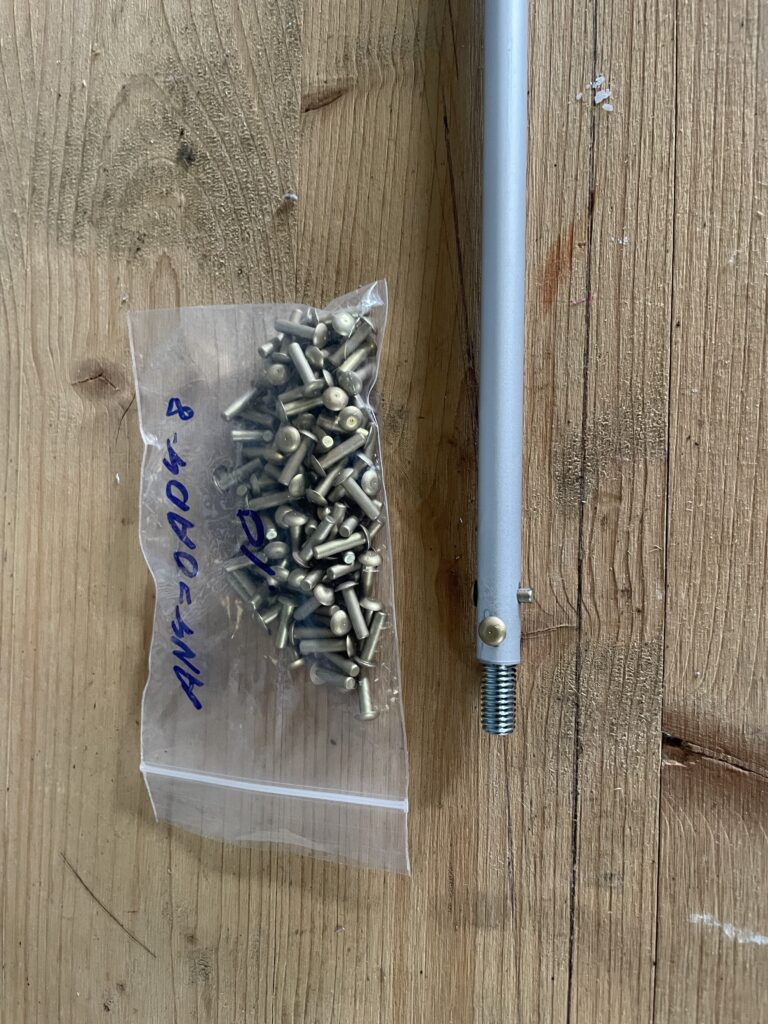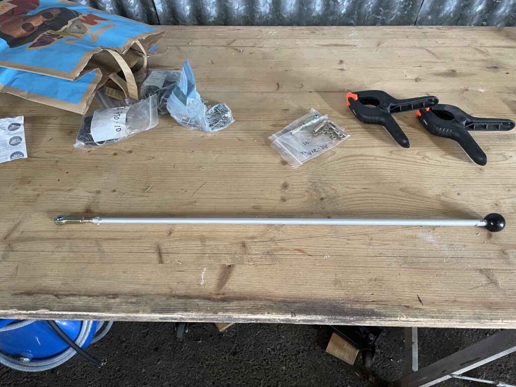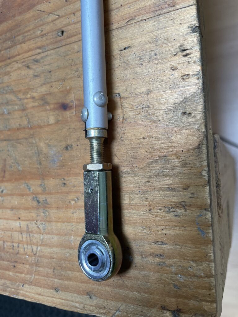 The main tricky part to installing the rear throttle is to find the exact right places to drill the holes. That’s what took the most time. Keeping in mind that the rod will move up and down as the throttle is moved from back to front. Not very much – probably about 8-10 millimeters. I used a rod end bearing on one end, and a random threaded black ball on the other. 10mm O.D./8mm I.D. aluminum tube from Jumbo. An 8mm bolt with the head cut off to attach the threaded black ball. A couple of snap bushings to avoid metal-metal contact between the tubing and the airframe.